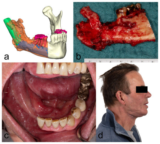 - Bettoni, J.; Olivetto, M.; Duisit, J.; Caula, A.; Testelin, S.; Dakpé, S.; Lengele, B.; Devauchelle, B. The value of reconstructive surgery in the management of refractory jaw osteoradionecrosis: A single-center 10-year experience. Int. J. Oral Maxillofac.Surg. 2019, 48, 1398–1404. [Google Scholar] [CrossRef] [PubMed]