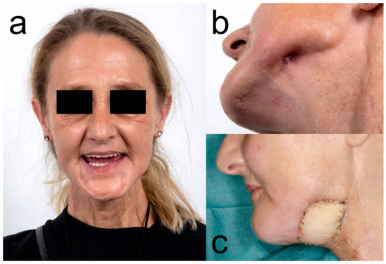 Clinical photos of the patient from Figure 3. (a) Preoperative situation with severely limited mouth opening. (b) Preoperative situation with extensive fibrotic soft tissue and extraoral cutaneous fistula on the left mandible. (c) Extraorally placed skin paddle of the fibular graft for reconstruction of the skin at the former site of cutaneous fistulae (one month after surgery).