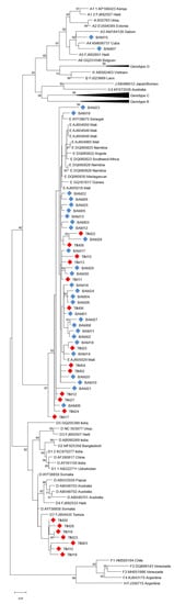 - Kumar, S.; Stecher, G.; Li, M.; Knyaz, C.; Tamura, K. MEGA X: Molecular Evolutionary Genetics Analysis across Computing Platforms. Mol. Biol. Evol. 2018, 35, 1547–1549. [Google Scholar] [CrossRef] [PubMed]