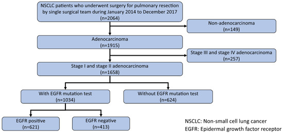 Medical records were reviewed retrospectively to select patients with pathological stage I or II lung adenocarcinoma, who underwent pulmonary resection at the National Taiwan University Hospital between January 2014 and December 2017. A total of 2064 patients received pulmonary resection between January 2014 and December 2017; among them, 1915 patients were diagnosed with lung adenocarcinoma. A total of 1658 patients had stage I or II lung adenocarcinoma (based on the American Joint Committee on Cancer (AJCC) 8th edition TNM staging system for lung cancer). The EGFR gene mutation test was conducted on 1034 specimens from stage I or stage II patients. EGFR mutations were detected in 622 (60%) patients. Figure 1 shows the flowchart of patient enrollment. This study was approved by the Institutional Research Ethics Committee (approval no. 202006178RINB). The requirement for informed consent was waived by the committee due to the retrospective nature of the study.