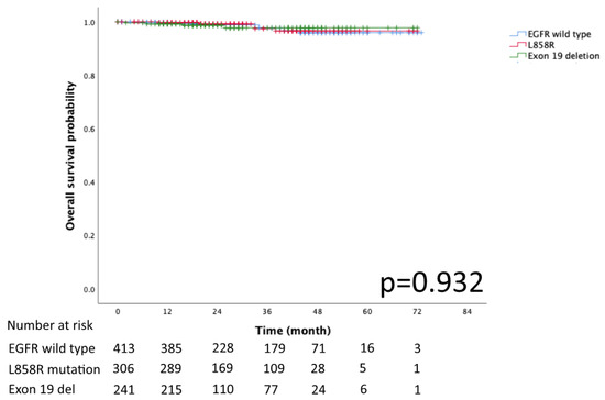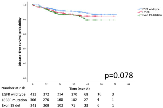 The Kaplan–Meier curves for DFS and OS in the EGFR mutation subtypes of exon 19 deletion, L858R and EGFR wild-type are presented in Figure 2 and Figure 3, respectively. No significant differences in DFS and OS were detected (p = 0.078 and p = 0.932, respectively).