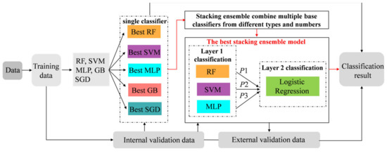 (ii) Construction of stacking ensemble models: We developed a two-level stacking ensemble model consisting of multiple basic classifiers and a single meta-learner. We employed the trained learners (RF, SVM, MLP, GB, SGD) for the base classifiers. The logistic regression (LR) as a meta-classifier was used to learn the truth from the base learners’ predicted scores (P1, P2, P3). The 26 stacking ensemble models were developed: combining two base learners (RF + SVM, RF + MLP, RF + GB, RF + SGD, SVM + MLP, SVM + GB, SVM + SGD, MLP + GB, MLP + SGD, SGD + GB); combining three base learners (RF + SVM + MLP, RF + SVM + GB, RF + SVM + SGD, RF + MLP + GB, RF + MLP + SGD, RF + GB + SGD, SVM + MLP + GB, SVM + MLP + SGD, MLP + GB + SGD); combining four base learners (RF + SVM + MLP + GB, RF + SVM + MLP + SGD, SVM + MLP + GB + SGD, RF + MLP + GB + SGD, RF + SVM + GB + SGD); ensemble five base learners (RF + SVM + MLP + GB + SGD). The best-performing stacking ensemble models were acquired.