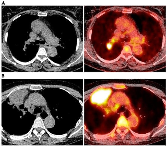 Integrated 18F-FDG-PET/CT scans of the chest. A—clinical N1 situation. B—clinical N2 situation.
