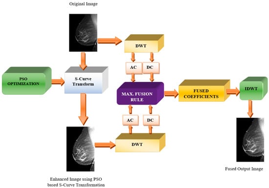 However, it is noteworthy that during the course of improving the visual quality of the breast image, the contrast-enhancement techniques tend to remove many important features from the image, thereby limiting the amount of information available for the detection of the tumors at an early stage [24,25,26,27,28,29]. This paper proposes an improved approach for this purpose in order to elevate the radiological interpretation of breast tomogram and mammogram images. To overcome the aforesaid ailments of the enhancement approach, the optimization of the S-Curve transform is carried out by modifying the sigmoidal function and its tuning parameters with the help of the PSO algorithm. To further support the loss of important features during the enhancement, the concept of image fusion has been deployed, which fuses the images unimodally, i.e., images belonging to the same modality (original and enhanced breast images). The paper is organized into the following sections: Section 1 provides an introduction to the subject along with a review of related works. Section 2 details the Optimized S-Curve Transform for Enhancement followed by a discussion of the proposed Wavelet-based fusion approach in Section 3. In Section 4, the analysis and discussion of the obtained results are presented along with the performance evaluation measures. Section 5 concludes the paper.