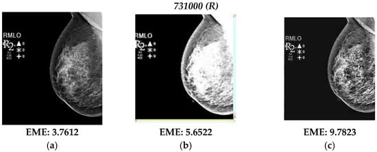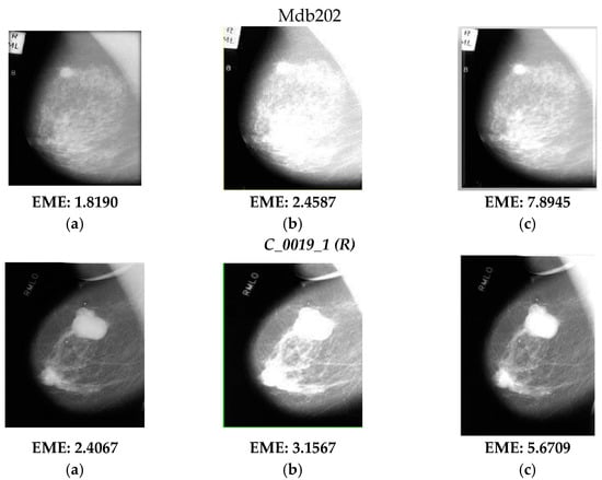 The visual results in Figure 2 show three cases; the first two are mammograms and the last one is a tomogram. It is evident in Figure 2b that the visual response by enhancement using the s-curve transformation function of Equation (1) yields medical images with overbrightness, causing saturation of gray-levels leading to a lack of visibility in certain regions, thereby obscuring the requisite diagnostic features. Although it could be demonstrated via Figure 2c that the response of enhancement is improved to a significant extent with the optimized s-curve transformation function. This is achieved by incorporating the PSO algorithm into the existing s-curve transform; the α and β parameters of Equation (1) are also tuned to their optimal values to yield maximum values of EME. The same can be illustrated by the increasing values of EME as shown for all three test cases in Figure 2.