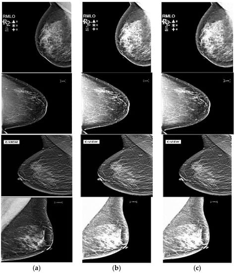 (a) Original images from MIAS, DDSM, and DBT Databases, (b) Enhanced Images obtained via Optimized S-curve Transformation, (c) Fused Images.