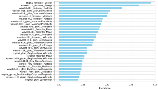 Top 30 radiomics features with importance evaluated by the Gini index in the random forest algorithm based on the development cohort. Gini Index is an effective measure of the impurity in the values of a dataset. In general, the higher the Gini index, the more important the feature is.