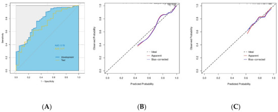 Predictive performance of the logistic regression radiomics model combined with alpha-fetoprotein (AFP) model at the model development cohort and the test cohort. (A) The combined model yielded an Area Under the Receiver Operating Characteristic curve of 0.78 in the development cohort and 0.71 in the test cohort. The calibration curve showed a good agreement between the combined model predicted probability and the actual probability in the development cohort (B) and the test cohort (C).