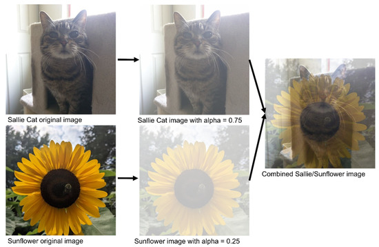 Visualization of the steps of MixUp data augmentation. Given two images to be mixed, the first image (top) is assigned a percentage representation value (between 0 and 1), and the second image is then assigned the complementary percentage representation. The two images are then combined to form the final image.