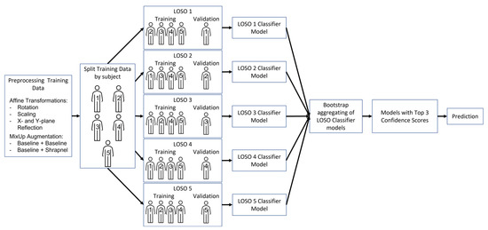 Flowchart describing the methods of this study, from data augmentation to final top 3 predictions, using LOSO training methodology to develop the final ensemble model.