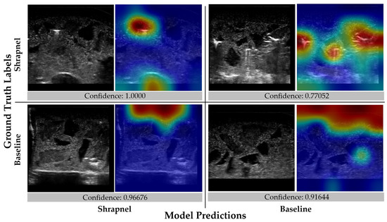 Gradient-weighted class activations mapping overlays for the initial ShrapML model. Representative images are shown with and without GradCAM overlays in a confusion matrix layout along with the prediction confidence.