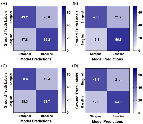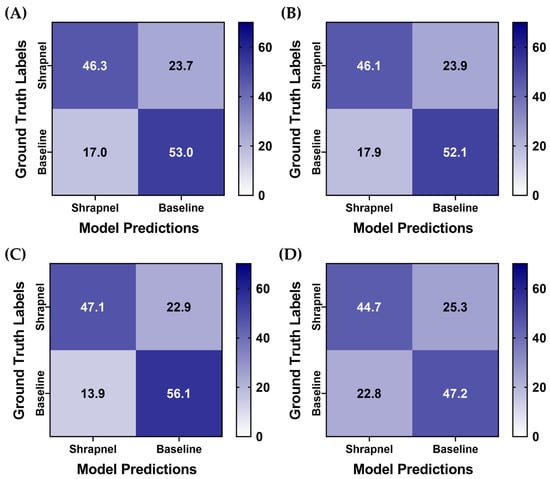 Data augmentation effects on blind test performance with a MobileNetV2 model architechture. Average confusion matrix results are shown for (A) no augmentation, (B) affine augmentation only, (C) MixUp augmentation only, (D) both affine and MixUp augmentations. Results are averaged for three training replicates for the five LOSO holdout runs. A total of 70 shrapnel and 70 baseline images were used for each blind test run.