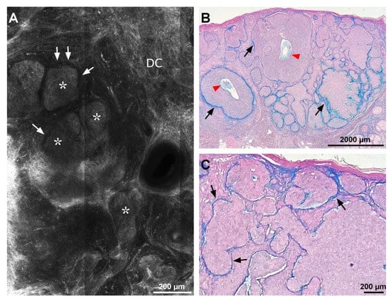 Correlation of reflectance confocal microscopy (RCM) image and colloidal iron-stained histological aspect of a nodular basal cell carcinoma (BCC). (A) RCM mosaic showing basaloid tumor nodules (white asterisks) displaying peripheral palisading, separated from dermal collagen (DC) by hyporeflective peritumoral spaces also known as clefts (white arrows). (B) Photomicrograph showing blue mucin deposits around, in between (black arrows), and inside (red arrowheads) single BCC tumor nodules (colloidal iron stain). (C) Histology corresponding to panel (A) showing BCC tumor islands separated from the adjacent dermis by mucin staining blue (black arrows) (colloidal iron stain). RCM and histopathology images belong to the same case.