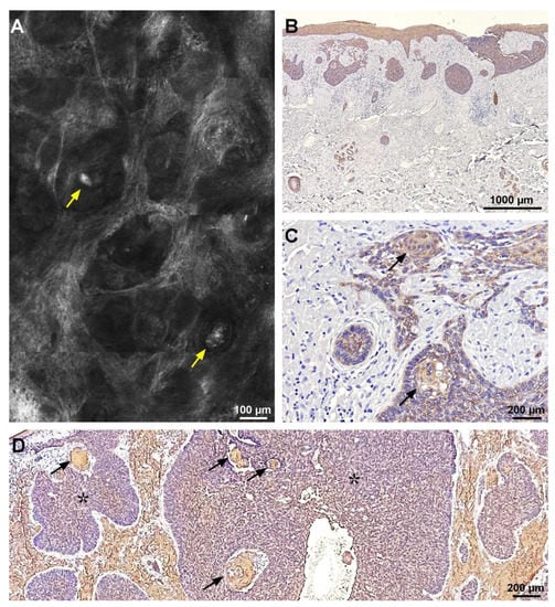 Correlation of reflectance confocal microscopy (RCM) image and CK34βE12 histological aspect of a nodular basal cell carcinoma (BCC). (A) RCM mosaic showing BCC tumor nodules with peripheral palisading and hyper-reflective globular structures within them (yellow arrows). (B) Histological image showing amyloid deposits stained in light brown (CK34βE12 stain). (C) Histology corresponding to panel (A) showing intra-tumoral amyloid deposits staining light brown (black arrows) (CK34βE12 stain). (D) Histological image displaying light brown, globular amyloid deposits (black arrows) inside BCC tumor islands (black asterisks) (CK34βE12 stain). RCM and histopathology images belong to the same case.