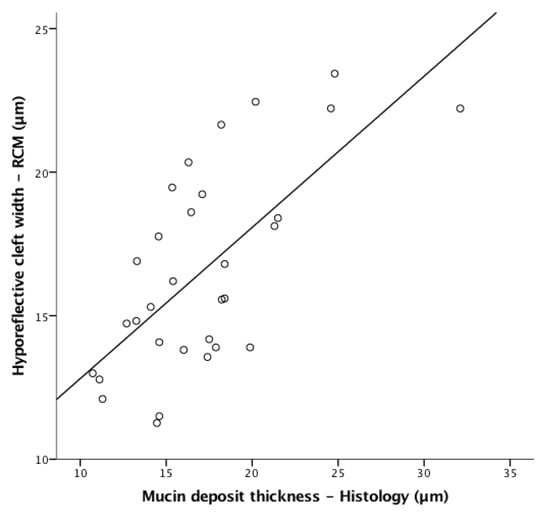 A linear correlation was present between the hypo-reflective clefts observed by RCM and the presence of mucin on histopathologic examination (Pearson r = 0.675, p < 0.001; Figure 3).