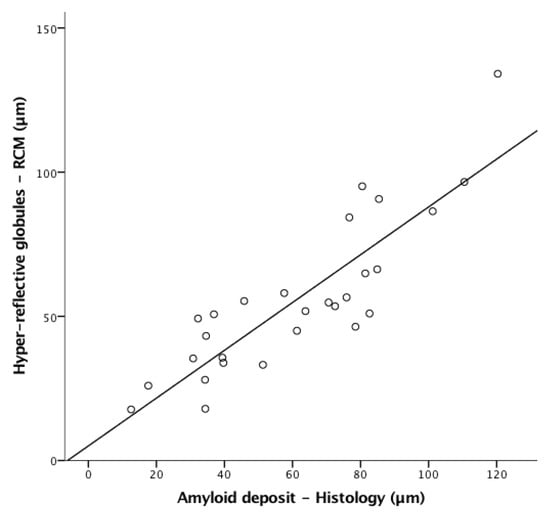 A strong correlation was also found between hyper-reflective globule mean size as measured by in vivo RCM and amyloid deposit mean size on histology (Pearson correlation r = 0.862, p < 0.001; Figure 4).