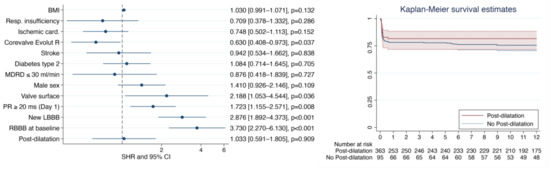 A total of 139 patients (26.1%) required PPI within the first 30 days post-TAVR (p = 0.446). The median delay of PM implantation was 3 (2–6) days. The indications were a complete AV block in 58% (86), AV block type 2 in 5% (8), and alternating bundle branch block pattern in 8% (12) of patients. We did not observe an increase in the AV block (p = 0.839). The multivariate analysis results showed that post-dilatation was not associated with PPI (SHR = 1.033 (0.726–1.471), p = 0.857) (Figure 3).