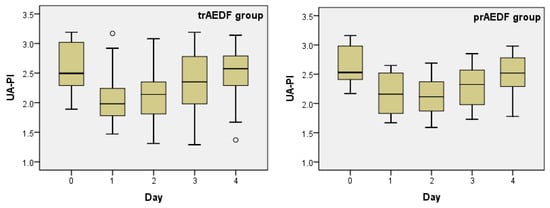 UA-PI significantly decreased in both groups on day 1. The decrease was even highly statistically significant in the trAEDF group. UA-PI continued to decrease slightly, reaching its minimum on day 2, but this decrease was not significant. Excepting one patient belonging to the trAEDF group with uncontrolled maternal hypertension and one fetus belonging to the prAEDF group who revealed newly occurred REDF in UA, both cases imposing termination of pregnancy during the third day, in all other cases, UA-PI returned to the values prior to steroid administration until day 4. In the prAEDF group, another fetus had to be delivered due to spontaneous heart decelerations on the 4th day and consecutively, the fourth day was not quantified in that case. The UA-PI values on day 2 and 4 were significantly different in both groups. There was also a statistically significant difference between day 1 and day 4 in the trAEDF group (p = 0.002) but not in the prAEDF group (p = 0.055) (Table 1, Table 2 and Table 3; Figure 1).