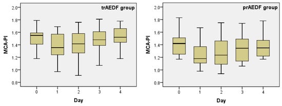 Boxplot charts on the pulsatility index’s evolution in the middle cerebral artery (MCA-PI), prior (day 0) and in the first 4 days after maternal dexamethasone administration, in the two groups (tr/prAEDF = transiently restored/persistent absent end-diastolic flow in umbilical artery group).