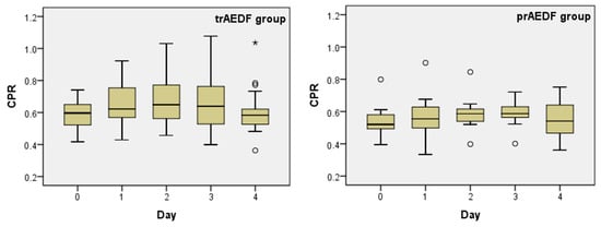 Boxplot charts on the cerebroplacental ratio (CPR) prior (day 0) and in the first 4 days after maternal dexamethasone administration in the two groups (tr/prAEDF = transiently restored/persistent absent end-diastolic flow in umbilical artery group).