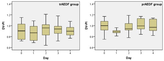 Boxplot charts on the pulsatility index in the ductus venosus (DV-PI), prior (day 0) and in the first 4 days after maternal dexamethasone administration, in the two groups (tr/prAEDF = transiently restored/persistent absent end-diastolic flow in umbilical artery group).