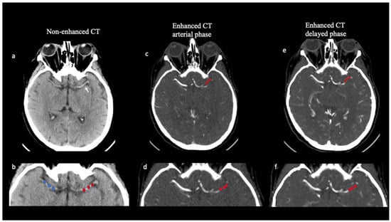 Thrombus attenuation measurements and thrombus perviousness quantification. Axial non-contrast CT (NCCT; a,b) demonstrates a hyperattenuating (“dense”) middle cerebral artery (MCA) (white arrow in a) in a 67-year-old patient with acute stroke. Thrombus attenuation measurement was calculated on NCCT as the difference between thrombus average density and contralateral artery by placing 3 spherical ROIs in the proximal, middle, and distal parts of the thrombus in the M1 segment of the left middle cerebral artery (red ROIs in b) and along the same vessel on the contralateral side (blue ROIs in b). Multiphase CTA (mCTA; c–f) identifies occlusion length of the M1 segment of the left middle cerebral artery, demonstrated as contrast-filling defects (square bracket in c,e). Three regions of interest (red ROIs) were placed in a left middle cerebral artery thrombus both in the arterial (c,d) and in the delayed phases (e,f) of the mCTA. Clot perviousness measurement was calculated as the difference in average thrombus attenuation measured on the arterial or delayed phase of mCTA and on NCCT.