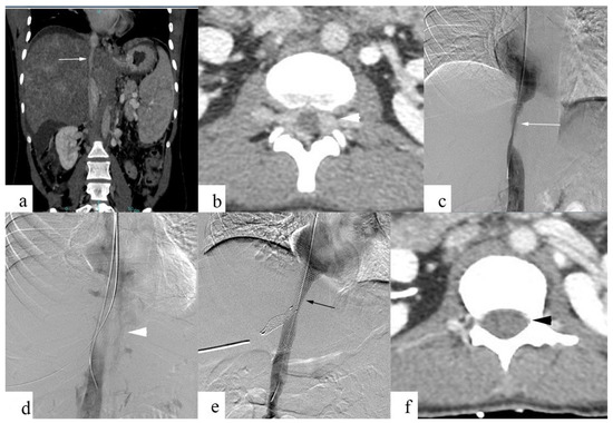 Chronic IVC stenosis in a 32-year-old male patient with Budd–Chiari syndrome and back pain. Contrast-enhanced CT and digital subtraction angiographic images show chronic IVC stenosis involving intrahepatic IVC (a,c; white arrow), and paravertebral venous plexus and epidural venous plexus enlargement (b,d; white arrowhead). Balloon angioplasty, primary stenting, and hepatic venous obstruction (e; black arrow) were performed for IVC, following which the resolution of EVEs (f; black arrowhead) was noted, along with back pain relief.