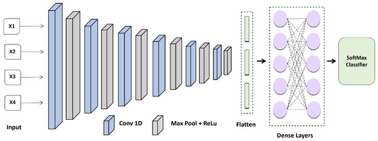 The CNN was configured with the following layer: Inputs → Convolution-1D (16 features, map size 7, relu) → Max Pool Layer(stride 3,2) → Convolution-1D (32 features, map size 5, relu) → Max Pool Layer(stride 3,2) → Convolution-1D (54 features, map size 5, relu) → Max Pool Layer(stride 3,2) → Convolution-1D (128 features, map size 7, relu) → Max Pool Layer(stride 3,2) → Convolution-1D (256 features, map size 7, relu) → Max Pool Layer(stride 3,2) → Convolution-1D (256 features, map size 8, relu) → Max Pool Layer(stride 3,2) → Flatten Layer → Dense (100 units) → SoftMax. The Adam optimization technique with categorical cross entropy produces better outcomes.