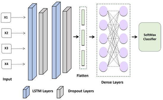 Therefore, in this study, the proposed method considered the result at each time stamp rather than only collecting the concealed factor at the output. Model 2 in Figure 6 represents the LSTM model’s suggested design. Each time-output stamp from the LSTM cell is added together and then transmitted via a dropout layer. After that, a fully linked layer receives the outputs of the single hidden layer. Last but not least, the chance that an ECG sequence belongs to a person is determined using a softmax function. The candidate individual is chosen as the one whose likelihood is at its highest. The LSTM’s construction is shown in Figure 6.