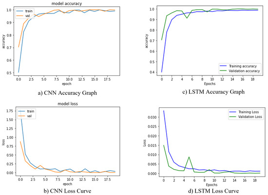 Training and validation loss curves of the proposed model. (a,b) shows the accuracy and loss curves for CNN model. (c,d) represents the accuracy and loss curves for the LSTM model.