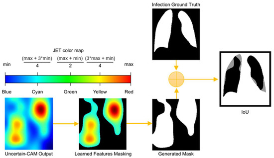 For a statistical evaluation of the proposed method, we applied the intersection over union (IoU) method, also known as the Jaccard similarity coefficient, to compare the Uncertain-CAM output with the ground truth, as illustrated in Figure 2 and Algorithm 2. The IoU is a statistical method used to gauge the similarity and diversity and is commonly used as an evaluation metric for semantic image segmentation. It ranges between 0 and 1, where 0 represents the absolute difference and 1 represents the absolute match. Let be the output RGB image of Uncertain-CAM mapped onto the JET color map and is the binary mask ground-truth image. We first converted to HSV color space (hue, saturation, value). The hue channel holds great significance in image processing applications that require object segmentation based on color because it represents the type of color. The saturation varies from unsaturated to representing grayscale, which is totally saturated. The value channel describes color brightness or intensity. Because the JET color map represents the feature importance to the class as it changes from blue (not relevant) to red (most relevant), we can segment using certain lower and upper color ranges representing only the activated features that produce a new mask image, containing only the learned features , where the IoU can be applied. These can be computed as