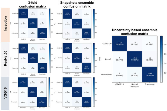 The COVID-19 pandemic, caused by the Severe Acute Respiratory Syndrome Coronavirus 2 (SARS-CoV-2), is considered the worst pandemic in over a century. It has resulted in unprecedented social and economic disruption globally. It was deemed a pandemic in March 2020 by the World Health Organization. Since then, researchers and physicians have put in several efforts to facilitate the early identification of coronavirus symptoms. According to PubMed [1], 755 research articles with the keyword “coronavirus” were published in 2019, and this number further increased to 1245 in the first 80 days of 2020. Due to an incomplete understanding of the viral genome at the beginning of the pandemic, early identification procedures for the disease were crude. The Real-Time Reverse Transcription Polymerase Chain Reaction (RT-PCR) test, also known as COVID-19 RT-PCR, is considered an optimum standard for detecting COVID-19. The RT-PCR is a qualitative method for detecting SARS-CoV-2 nucleic acids present in respiratory specimens at the time of infection [2]. However, there are still numerous difficulties in COVID-19 detection, including the low sensitivity rate of RT-PCR, which is only 60–70%, along with the high costs associated with the test [3]. As COVID-19 primarily manifests as a lung infection [4], the computed tomography (CT) and chest X-rays (CXRs) have been widely employed for its identification. Artificial intelligence and deep learning techniques have been frequently used to detect COVID-19 infection from CT and CXR images. The deep learning techniques are highly popular because they have outperformed conventional methods. The performance of deep learning algorithms has been demonstrated in various scientific applications, such as computer vision [5], object tracking [6], face identification [7], and surgical skill assessment [8]. In contrast to conventional and machine learning techniques, the training features need to not be selected manually. A model can be trained to learn the best features from the dataset used by adjusting the parameters and convolutional neural network (CNN) architecture. Even before the coronavirus pandemic, deep learning techniques were widely integrated in medical imaging. However, since the pandemic, the popularity of the deep learning techniques has increasingly dramatically, and there has been a subsequent rise in the applications in diverse fields, including medical image processing, data science approaches for pandemic modeling, AI for text mining and natural language processing, AI and the Internet of Things, AI in computational biology and medicine [9], and for COVID-19 detection [10]. Because the main characteristics of COVID-19 lung infection are the consolidations and areas of ground-glass opacity (GGO) [11], CXR datasets are suitable to test algorithms for spotting COVID-19 and other lung diseases. The CNNs are at the forefront of illness classification for diagnosis, as well as region of interest segmentation in medical images owing to their ability to accurately learn local features from a specific medical image, such as a CT scan or chest radiograph. A common strategy used to improve the classification performance is to combine the results of various classifiers to produce the final output. The output scores of the individual classifiers are used to combine ensemble techniques. These classifiers may possess multiple architectures for capturing various data items or input vectors produced from the same data instance. Existing methodologies primarily focus on achieving high-performance accuracy without adequately elaborating on what CNNs actually learn or delving into fundamental CNN problems, such as overconfidence predictions and uncertainty evaluations, which are crucial factors in the field of medical diagnosis.