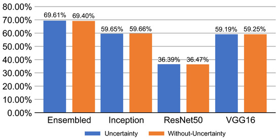 An uncertainty-aware framework, which utilized transfer learning to detect COVID-19 using X-ray and CT images, was presented in 2021 by Shamsi et al. (2021) [23]. Different pretrained CNNs were used in their proposed framework to extract deep features from CXR and CT images. Additionally, they used different machine learning and statistical modeling techniques to diagnose COVID-19 and gauge the epistemic uncertainty of the categorization outcomes. The MixMatch semi-supervised framework, introduced by Calderon et al., was aimed at enhancing the model uncertainty estimation for COVID-19 identification [24]. Numerous methods have been proposed for estimating the uncertainty in a test, including MC dropout, deterministic uncertainty quantification, and softmax scores. A deep learning system, RCoNetK, was also suggested by Dong et al. for COVID-19 detection and uncertainty estimation [25]. They used multi-expert uncertainty-aware learning, mutual information maximization, and deformable mixed high-order moment features. The RCoNetK model successfully classified X-ray images into COVID-19, pneumonia, and normal classes, and it yielded a sensitivity of 97.76%.