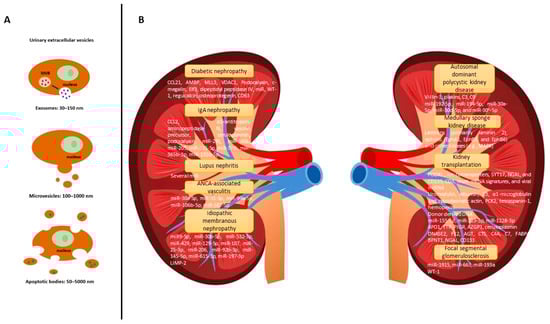 (A) The classification of extracellular urinary vesicles. Abbreviation: MVB: multivesicular bodies. (B) The potential value of urinary extracellular vesicles in chronic kidney diseases.