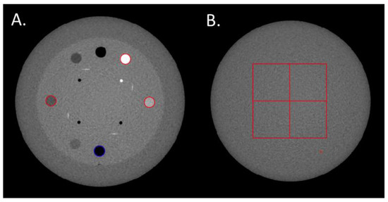 Figure 1. (A) Regions of Interests (ROIs) placed on the Delrin, LDPE, Teflon and air inserts to compute the Task-based Transfer Function. (B) The four ROIs used to calculate the Noise Power Spectrum.