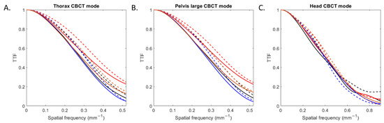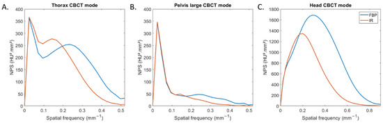 Figure 2 depicts the NPS curves obtained for all CBCT modes and both reconstruction types. For thorax and pelvis large modes, two NPS peaks were found: one placed at low spatial frequencies (0.02 mm−1) and the other at higher spatial frequencies (Figure 2A,B). For head mode, one NPS peak was found for both reconstruction types (Figure 2C).