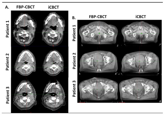 Figure 4. Comparison of head and neck (A) and pelvis (B) reconstruction with FBP (FBP-CBCT) and IR (iCBCT) on three patients. The series were matched on the same location and visualized with the same windowing.