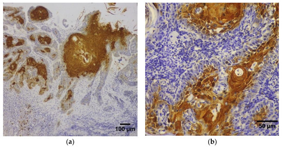 Photomicrographs of immunohistochemical staining for HIF-1-α in OSCC tumor samples: (a) SCC of the oral tongue infiltrating the underlying stroma with tumor islands exhibiting central areas of intensive HIF-1-α immunostaining (magnification ×100), (b) SCC of the oral tongue showing tumor islands with central zones of HIF-1-α immunoreactivity in the nuclear and cytoplasmic compartments of the tumor cells (magnification ×400).