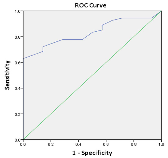 Since HIF-1α expression in normal tissues is low to none, we sought to evaluate HIF-1α overexpression as a diagnostic biomarker assessing its sensitivity and specificity using all four cut-offs (quantifications). The cut-off carrying the highest diagnostic accuracy was >10% cells with moderate-to-marked intensity (sensitivity = 70%, specificity = 100%). The diagnostic accuracy of HIF-1α increased expression calculated using weighted HS was also assessed through ROC curve analysis. The area under the curve (AUC) for HIF-1α was 0.833 (95% CI, p < 0.001) (Figure 4).