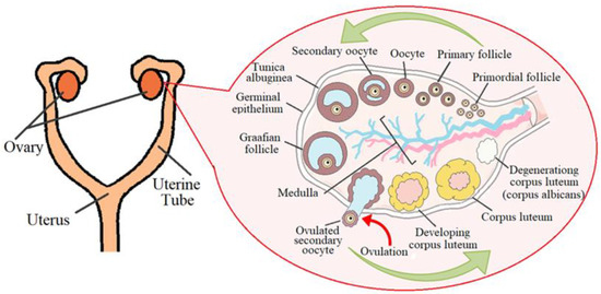 The ovaries are a paired organ located on the sides of the uterus, next to the ampullar sections of the fallopian tubes, their size in women ranges from 1.5 to 5 cm [31] and in cats, from 0.5 to 1.5 cm [32]. From above, the ovaries are covered with a layer of the epithelium; the next layer consists of connective tissue and contains many elastic fibers (Figure 1). The medulla contains many blood vessels and nerve endings. In the cortical layer, there are follicles in which eggs are formed and mature.