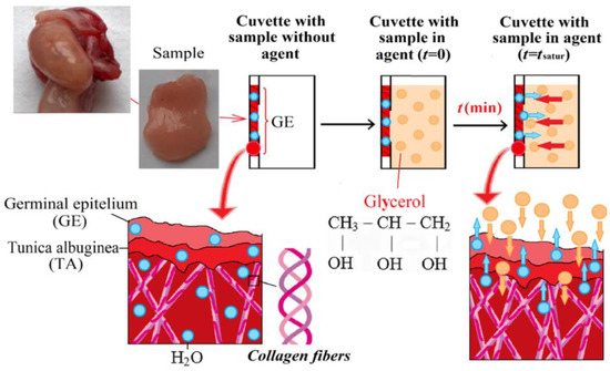 Glycerol is a well-known effective hyperosmotic agent and is often used for the optical clearing of tissues [13,14,15,16,17,38,39,41,42]. To evaluate the efficiency of optical clearing of ex vivo tissue samples, TTS measurements are usually used, and the efficiency parameter Q is calculated: