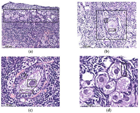 Histology of clinically healthy cat ovaries in the follicular phase: (a) primordial follicles; (b) primary follicle (1): granulosa of the follicle (2), shiny sheath of the follicle (3); (c) oocyte (1): granulosa of the oocyte (2), the shiny coat of the oocyte (3); (d) flattened follicular cells surrounding the oocyte.