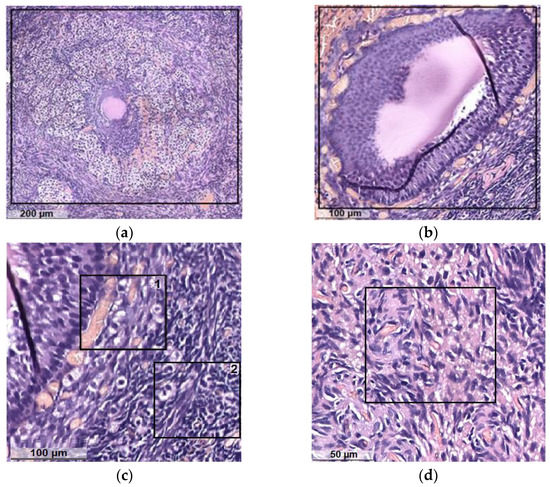 Histology of clinically healthy cat ovaries in the luteal phase: (a) corpus luteum; (b) atretic follicle; (c) follicular theca with an abundance of blood vessels: 1—internal, 2—external; (d) interstitial connective tissue.