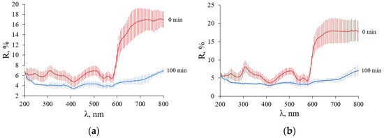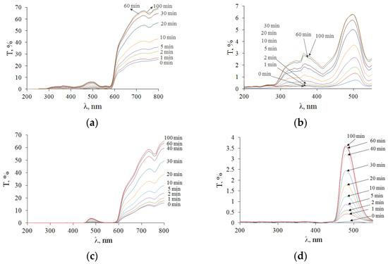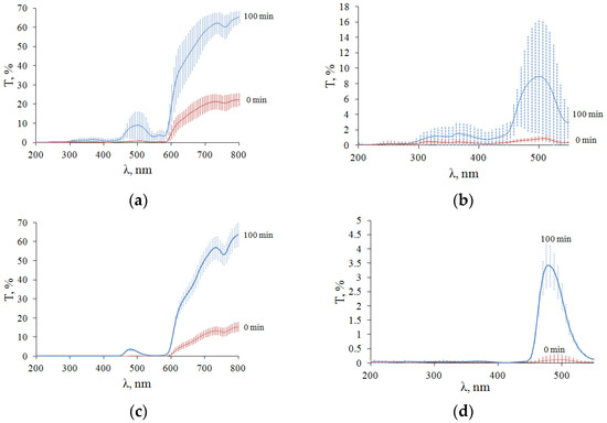 The TTS kinetics for typical samples is shown in Figure 10. In contrast to the DRS, the TTS of the two types of ovarian tissue samples have noticeable differences. The transmittance of both types of samples in the UV is close to zero. The TTSs of light samples (F-ph) show absorption bands of blood hemoglobin, which correlate with the DRSs (Figure 9a). For the TTSs of the dark samples (L-ph), the transmittance is practically zero from 200 to 450 nm and then at 540–590 nm. Obviously, this is due to the fact that this type of ovarian tissue is largely supplied with a capillary network filled with blood. The initial (0 min) and final (100 min) average TTS for all five samples for each type of ovary are shown in Figure 11.