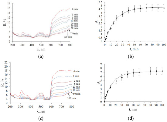 DRSs of cat ovarian tissue samples during 99.5% glycerol immersion. The corresponding kinetics of the difference in effective optical densities at the current and initial time ∆A(t, λ) were recorded at 600, 700 and 800 nm and then averaged (see Equation (1)) of the studied ovarian samples during the application of glycerol. The symbols represent the experimental data, and the solid curves represent the corresponding approximation of the experimental data within the framework of the free diffusion model; (a,b) F-ph; (c,d) L-ph.