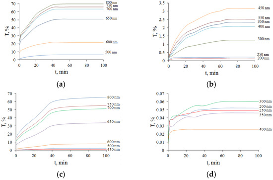 The kinetics of change in transmittance for different wavelengths are shown in Figure 12. When a more blood-filled ovary in the luteal phase interacts with glycerol, hemoglobin is rapidly washed out, which goes quickly, as the erythrocytes burst due to osmosis and, together with tissue water, hemoglobin goes into a larger volume of the surrounding solution. Thus, transmission is increased not only by decreasing scattering but also by decreasing the absorption of hemoglobin and its forms, which is a much faster process (see Figure 12d) [50].