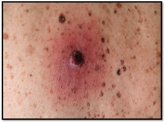 The patient we present was an 87-year-old man, in good general condition, who, in his medical history, reported the appearance of a nodular bleeding greyish lesion with irregular borders, on erythematous skin, present for two years (Figure 1). By virtue of the clinical and dermoscopical features, surgical removal with large resection margins was performed, and the sample was sent to the pathological anatomy laboratory, with the clinical suspicion of MM or squamous cell carcinoma (SCC). After fixation in 10% buffered formalin, sampling, processing, and inclusion in paraffin, sections of about 5 microns thickness were prepared, stained with hematoxylin–eosin (H&E) of routine, and further sections were kept for immunostaining with antibodies for melanocytic markers.