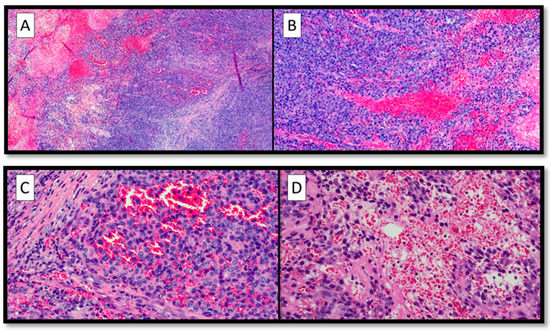 (A) Panoramic histopathological view of the lesion examined: note the presence of an abundant pseudo-vascular cell component with extravasated erythrocytes (hematoxylin–eosin, original magnification 4×). (B) Histological preparation showing cytological details of the neoplastic cells: pleomorphic, atypical elements, with pseudo-vascular appearance (hematoxylin–eosin, original magnification 10×). (C) Photomicrographs showing pseudo-vascular structures containing red blood cells, with some foci of necrosis (H&E, original magnification 20×). (D) Details of the previous picture showing foci of hemorrhage (H&E, original magnification 20×).