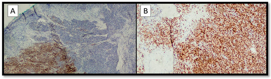 The following findings were appreciated on immunohistochemical examination: the differentiated component was almost entirely positive for S-100, Melan-A, and HMB-45, but the dedifferentiated component was totally negative for the above markers (Figure 3A); immunohistochemical staining for SOX-10 was almost entirely positive in both components (Figure 3B). Interestingly, the neoplastic proliferation index (Ki67+) was about 5–6% in the differentiated component (Melan-A +, HMB-45 +, S-100 +) and about 20% in the dedifferentiated component (Melan-A -, HMB-45 -, S-100 -) with pseudo-angiomatous aspects.