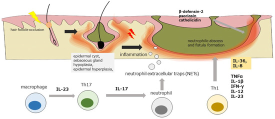 The infiltration of neutrophils, macrophages, and dendritic cells is seen in the initial inflammatory reaction in HS. Toll-like receptor 2 (TLR2) expression was enhanced in macrophages and dendritic cells, suggesting the possibility of microbial-derived substances serving as ligands for the induction of inflammation [18]. Macrophages abundantly express the inflammatory cytokines IL-12 and IL-23 [19]. IL-23 is involved in lesional Th17 cell infiltration [20], which induces further inflammation by releasing neutrophil extracellular traps (NETs) consisting of nuclear chromatin and granules from neutrophils [21]. Various inflammatory cytokines, such as TNF-α, IL-1β, IFN-γ, IL-12, IL-23, and IL-36, which are thought to be related to Th1 and Th17 cells, are expressed in lesions [22]. In addition, increased expression of IL-36, a member of the IL-1 family, is observed in lesions and is involved in the pathology of HS through the induction of IL-8 [23]. The production of antimicrobial peptides, such as β-defensin-2, psoriasin, and cathelicidin, is also enhanced in lesions [24]. These inflammatory cytokines directly induce various forms of tissue damage [25,26,27]. Interestingly, TNF inhibitors have been reported to reduce these inflammatory cytokines [28].